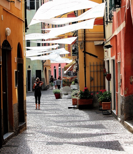 Tag: strada, vicolo, vasi, ombre, fiori, teli, porte, ombra, tende, passanti, bianco.