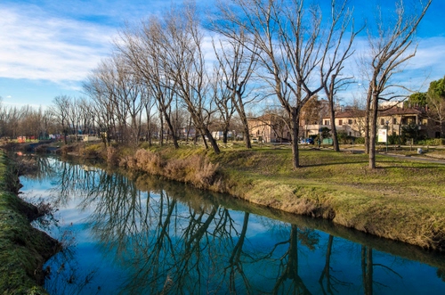 Tag: alberi, acqua, riflesso, fiume, canale, nuvole, azzurro, riflessi, case.