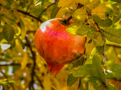 Il melograno è molto fotogenico e qui è bello in contrasto con giallo e verde delle foglie.