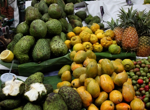 Frutta varia in vendita in un mercato popolare in Guatemala.