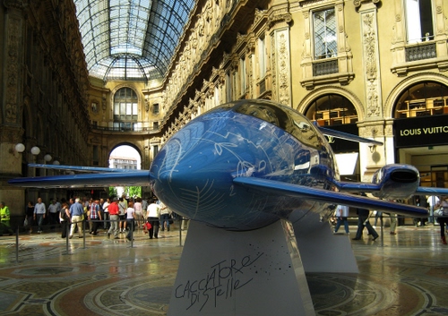 Un Piaggio P.180, liberamente interpretato come "Cacciatore di stelle", esposto in Galleria Vittorio Emanuele a Milano.