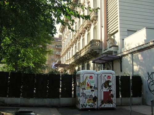 Evidente era il contrasto tra i bagni chimici della Caritas di P.le Concordia,a Milano, e la facciata del lussuoso albergo Chateau Monfort. Ora li hanno spostati in posizione un po' più defilata, ma forse avrebbero fatto meglio a lasciarli dov'erano per vari motivi. Non è la sede adatta per fare politica: ognuno interpreti la mia frase come preferisce.