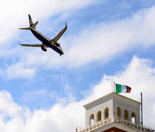 Tag: bandiera, aereo, cielo, nuvole, tricolore, ali, torre, archi, scie.
