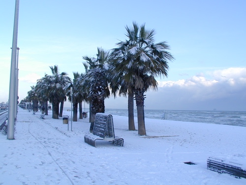 Bello l'abbinamento mare e neve ma avrei composto lo scatto in modo diverso. Potendo (per le dimensioni) avrei eliminato i pali a sx, un po' di selciato in basso e la mezza panchina a dx. |