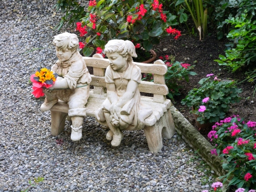Tag: panchina, fiori, bambini, giardino, statue, ghiaia, piante, aiuola, bianco.