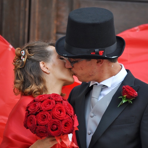 Tag: bacio, rosso, rose, cappello, sposi, fiori, coppia, nero, cilindro, bouquet, cravatta, sposo.