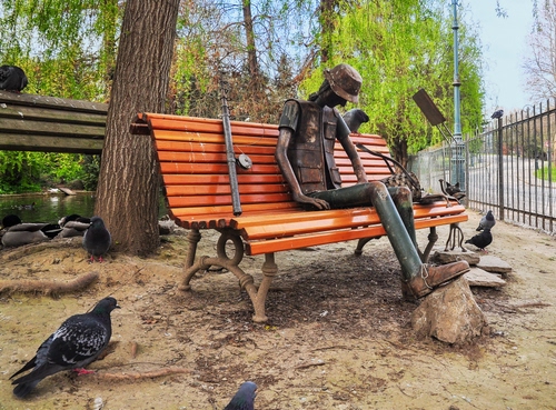 tutte originali le tue panchine ; questa mi piace tanto - la trovo un'ottima composizione e il "poveretto" ha solo i piccioni come compagnia ...