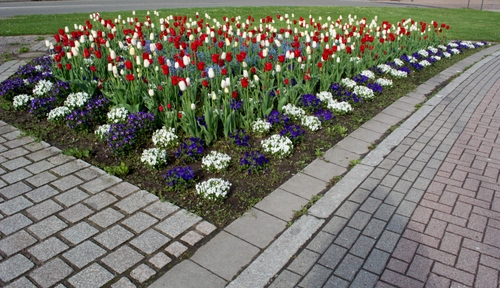 Tag: fiori, aiuola, bianco, verde, rosso, tulipani, erba, viola, strada, mattonelle, aiuole, colori.