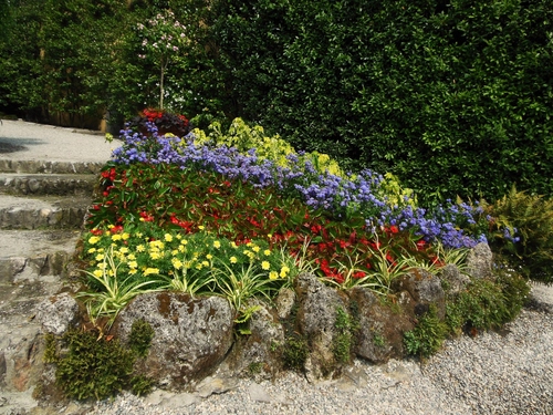 Tag: fiori, aiuola, sassi, giallo, rosso, piante, scalini, verde, azzurro.