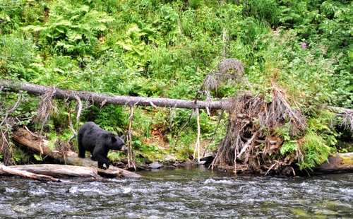 Questo orso nero è a pesca di salmoni nel Russian River in Alaska.