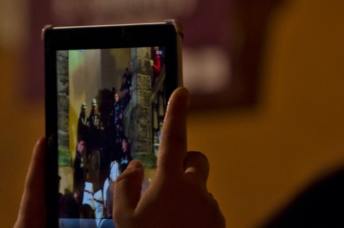 Passata mezzanotte una bellissima ragazza riprende, con il suo smartphone, l'uscita dei Perdoni e della Processione dei Misteri a Taranto.Il particolare della meravigliosa scala della Chiesa di San Domenico nel Borgo Antico.