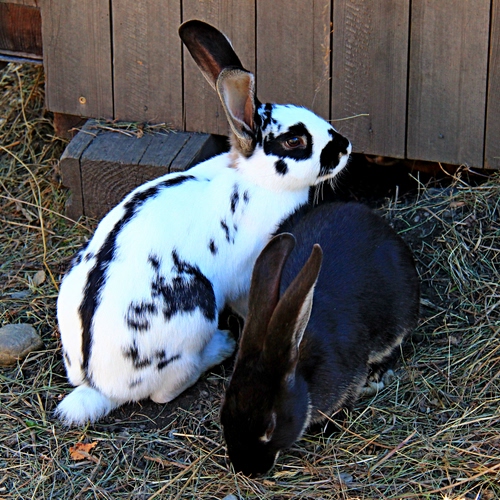 Tag: conigli, animali, nero, bianco, orecchie, paglia, legno, due, erba, coda, coppia, fieno, occhi.