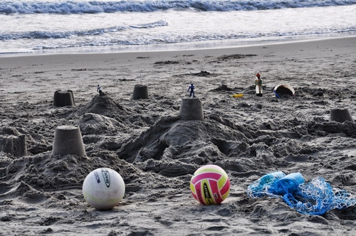Tag: mare, sabbia, spiaggia, palloni, palle, acqua, due, rete, castelli, onda, soldatini, secchiello, giochi.