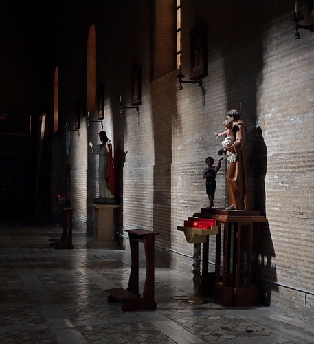 Tag: statue, ombre, chiesa, inginocchiatoio, devozione, santi, statua, luci, interno, muro, lumini.