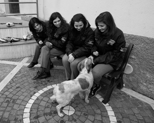 foto scattata a cardeto un paesino aspromontano della provincia di reggio cala. durante la festa di S.Sebastiano il 20 gennaio 2013 , le ragazze appartenenti alla banda musicale seduti durante una pausa, ed il cane senza padrone che scorazzava nella piazza e si avvicina al gruppo per cercare affetto.