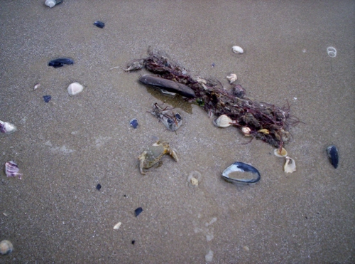 granchi, conchiglie ed alghe portate sulla spiaggia
