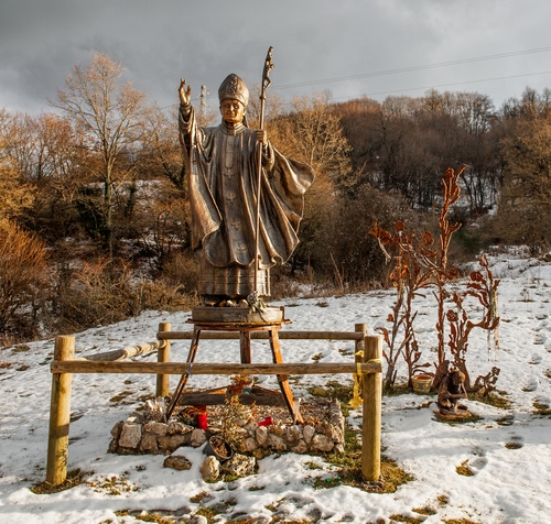Tag: neve, statua, alberi, inverno, papa, legno, piante, bianco, sassi, bronzo, pietre, fiori.