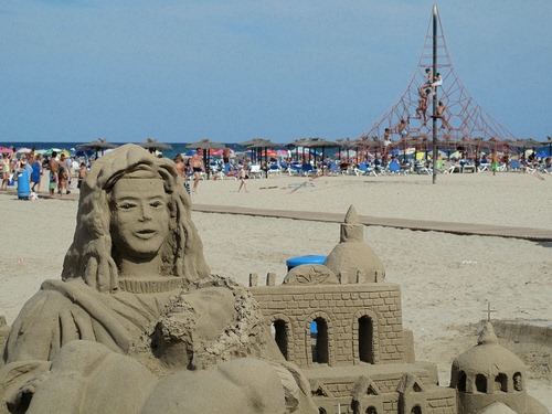 In una spiaggia della Costa Blanca, uno scultore della sabbia espone la sua effimera opera.