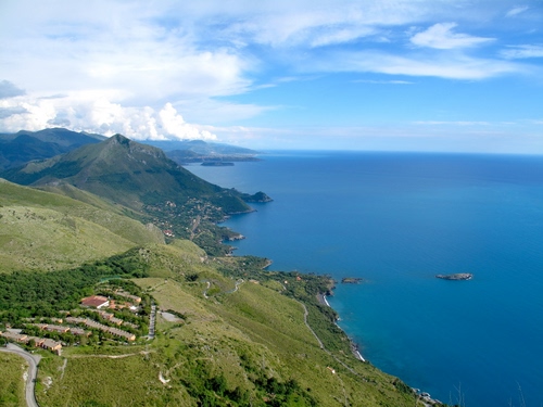 Il panorama è ripreso dalla statua del Redentore sul Monte San Biagio a Maratea. Sulla sinistra il villaggio/residence PianetaMaratea. A destra, sul mare a breve distanza dalla costa, lo scoglio della Matrella e l'isolotto di Santo Janni. Segue il promontorio, con resti di castello, di Castrocucco. In lontananza, già in Calabria, l'isola Dino.