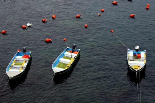 Tag: barche, tre, mare, acqua, galleggianti, boe, boa, arancione.