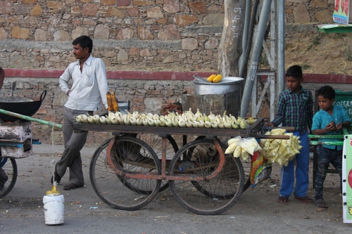 Venditore di pannocchie di mais in un mercato di Udaipur (india).