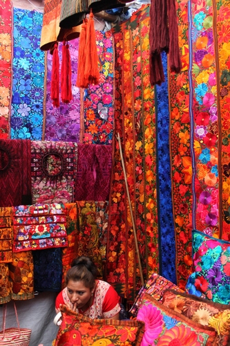 Venditrice di stoffe al mercato di Chichicastenango (Guatemala).