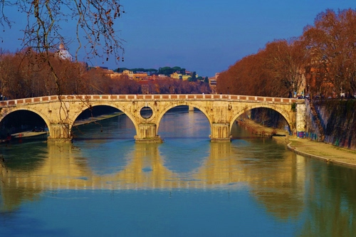 Tag: ponte, fiume, alberi, archi, riflessi, riflesso, acqua, autunno, azzurro, cielo, città, arcate, rami, cupola.