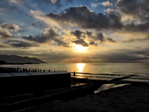 Altri tag (senza riscontro): nero, orizzonte, costa, stabilimento, azzurro, sabbia, giallo, cabine, arancione, celeste, lago, promontorio, silhouette, montagne.