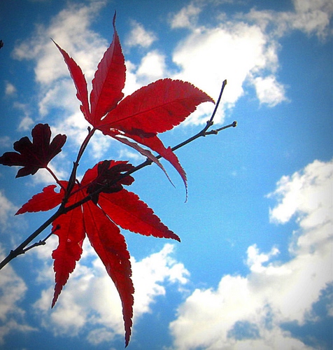 Belle queste foglie rosse in contrasto con celeste e bianco del cielo!