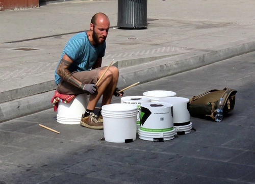 Tag: bacchette, strada, uomo, zaino, secchi, bianco, artista, seduto, bidoni, marciapiede, marciapiedi, plastica, musicista, barba, suonatore, marrone, tatuaggi, tatuaggio, maglietta.