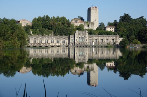 Una centrale elettrica che non deturpa né il paesaggio né i resti del castello medievale di Trezzo d'Adda che si vedono sullo sfondo.