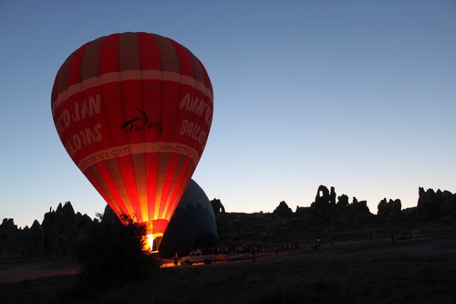 Mongolfiera in fase di gonfiaggio in Cappadocia (Turchia).
