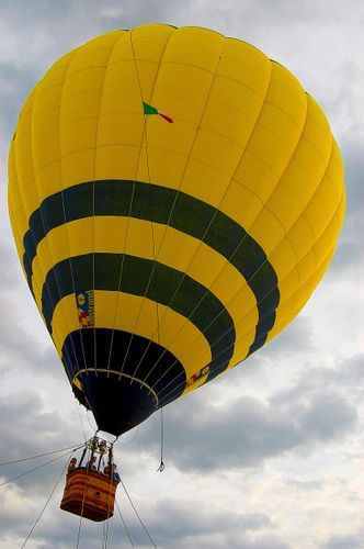 Tag: giallo, mongolfiera, nero, nuvole, persone, cielo, bandiera, pallone, volo, volare, cesto, righe, cesta, corde, fili.