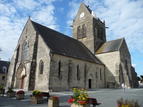 Sainte- Merè-Eglise fu il primo comune francese ad essere liberato dall'occupazione tedesca durante lo sbarco in Normandia.Sul campanile della chiesa e' stato posto un manichino di un paracadutista, in ricordo di uno dei piu' celebri episodi dello sbarco, l'Americano John Steele fini' con il suo paracadute impigliato sul tetto del campanile rimanendo appeso per molte ore, ma salvandosi dallo scontro a fuoco con i tedeschi.