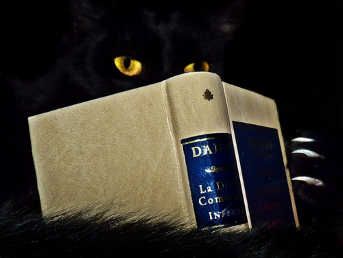 @Luisella: Assolutamente no. Mia mamma colleziona le miniature, il libro nella foto misura 4 x 5 cm (lo puoi vedere qui, il libro chiaro sotto "Canti" di Leopardi: http://www.dizy.com/it/foto/772576002 ). Ho messo la miniatura fra le zampette del mio gatto, che adora posare per le foto, e lui ha collaborato tirando fuori le unghiette per fare la scena adatta al titolo. ![]() |