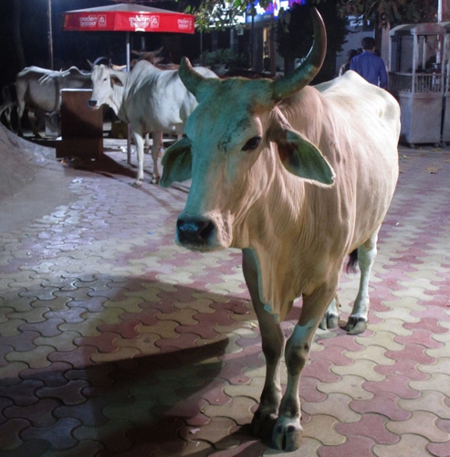 Bovini in notturna in una piazzetta di Varanasi (India).