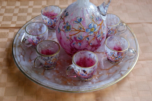 sei bicchierini, una bottiglia ed il vassoio di vetro