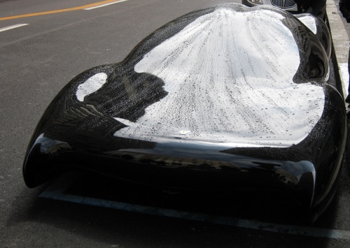 Strana pseudo-auto in plastica bagnata di pioggia in una strada di Milano.