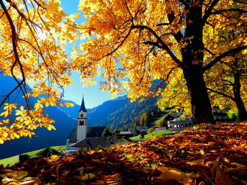 Ottimamente composta: la chiesetta disposta secondo i terzi, incorniciata sia dalle foglie per terra, sia da quelle sui rami. Bellissimi i colori - con un interessante contrasto fra il giallo delle foglie e l'azzurro delle montagne. Buona la profondità di campo. Un controluce molto ben gestito che sfrutta appieno la bellezza del luogo.
