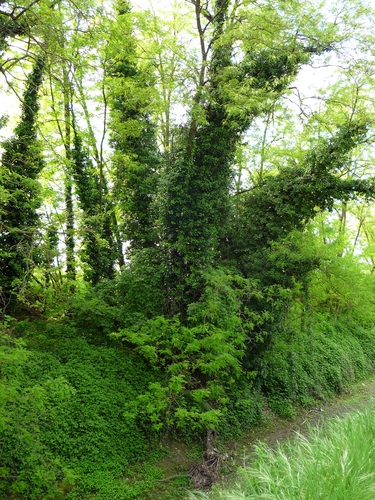 vegetazione di rampicanti e foglie di ogni tipo che ricoprono le piante ai bordi del canale