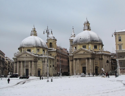 Roma - Piazza del Popolo - Le chiese gemelle (ma non troppo) di Santa Maria in Montesanto (a sinistra) e di Santa Maria dei Miracoli (a destra)