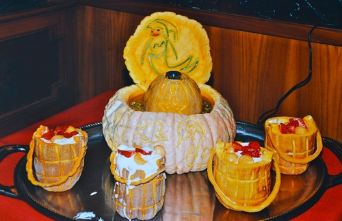 Questo piatto merita una spiegazione, perchè la foto non rende giustizia alla sua presentazione. Infatti la zucca grande è trasformata in fontana con acqua a ciclo continuo, dove vi sguazza un pesciolino rosso. Per vostra tranquillità è da dire che il pesciolino è tornato, al termine della cena, vivo e vegeto nel suo acquario.