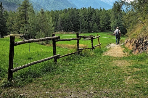 Tag: alberi, staccionata, verde, sentiero, legno, bosco, erba, uomo, prato, zaino, persona, steccato, camminare, abeti, cielo, paesaggio, rami.