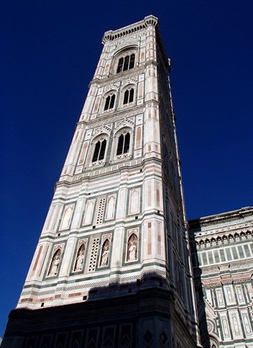 Campanile di Giotto: in stile gotico, alto 85 metri e rivestito da marmi bianchi, verdi e rossi (come quelli della Cattedrale). Fu iniziato nel 1334 da Giotto, fu proseguito da Andrea Pisano e fu portato a termine nel 1359 da Francesco Talenti.