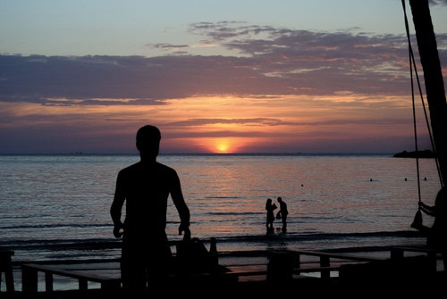 Questo scatto è uno dei ricordi più belli che ho del mio viaggio in Thailandia. Il mio intento era rendere consapevole chi avrebbe guardato la foto che il tramonto è pur sempre uno spettacolo che esercita un notevole fascino. Soprattutto perché è una di quelle cose che a mio parere rappresenta il bello per antonomasia. Non avendo a disposizione un cavalletto per quel viaggio, ho dovuto usufruire dei tavolini in legno che si possono intravedere nell'immagine come base d'appoggio. Fortuna vuole che abbia avuto anche il tempo di gustarmi una birra e di osservare l'incantevole scenario.