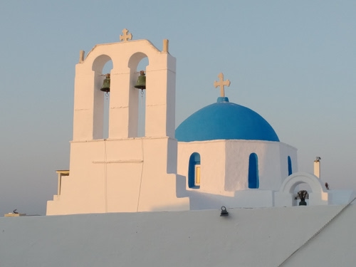 ho scattato questa foto rapita dal gioco di colori tra i raggi del sole al tramonto e l'inconfondibile architettura bianca greca. ho scelto questa foto in quanto credo racchiuda una grande forza, la luce colpisce esattamente le due croci sul tetto della chiesa, come quasi simbolo della divinità.