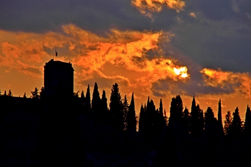 Foto dell'autore MV03041951 candidata al contest fotografico silhouette su Dizy. Data inserimento: sabato 26 agosto 2017. Titolo: Silhouette di torre e cipressi