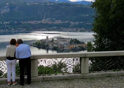 Tag: lago, isola, alberi, verde, due, persone, balaustra, coppia, parapetto, acqua, montagna, affaccio, terrazza, campanile, bianco, case, azzurro, pantaloni, belvedere, ringhiera, borgo.