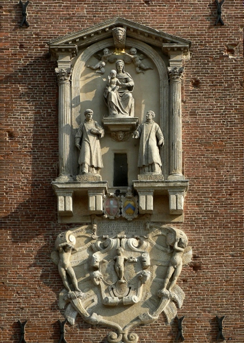 Grupopo scultoreo della Madonna Incoronata con Bambino e due Santi, posto sulla parte bassa della Torre Bissara.