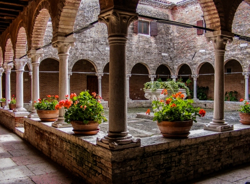 Tag: fiori, colonne, archi, vasi, chiostro, pozzo, finestre, rosso, verde, gerani, piante, portico, capitelli, colonnato.